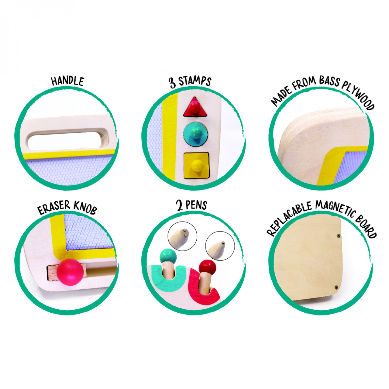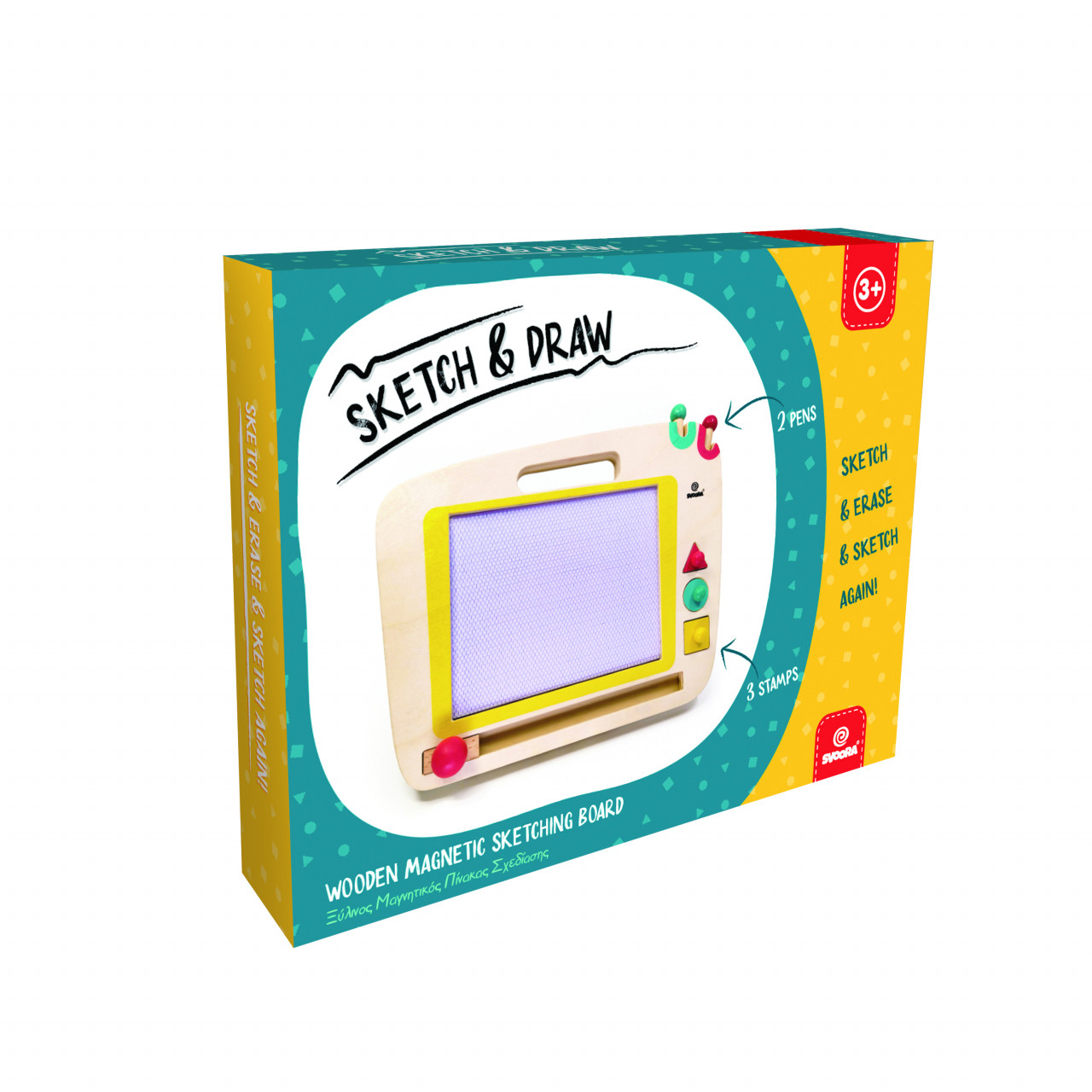 Tablă magnetică de desen 'Sketch & Draw' O jucărie distractivă care amintește adulților de jocul nostalgic Planșa magnetică din lemn pentru schițe! Desenează, șterge și desenează din nou! Cu ajutorul așchiilor magnetice metalice din interiorul planșei, puteți crea imagini nesfârșite, iar printr-o o simplă ștergere puteți începe de la zero. Cele 3 ștampile cu forme de bază și cele 2 stilouri cu vârfuri diferite care sunt incluse, vă pot ajuta să desenați tablouri a căror limită este doar imaginația! Suprafața din lemn oferă stabilitate și o experiență unică de desen. Panoul magnetic este înlocuibil, deoarece partea din spate a planșei poate fi dezasamblată. Fabricată exclusiv din lemn de fag și placaj, cu margini rotunjite și culori non-toxice, pentru a asigura siguranța copiilor. Mânerul său o face durabilă, astfel încât să fie ușor de transportat peste tot! Pregătiți-vă să vă încântați publicul cu creații frumoase și unice! Dimensiune 30 x 23 x 1.6 cm. Vârsta recomandată: + 3 ani. Fabricat din lemn de fag cu vopsele pe baza de apa. Conform standardelor EN71, ASTM, AVERTISMENT! Contraindicat copiilor sub 3 ani. A se folosi sub directa supraveghere a unei persoane adulte. Producător: Svoora, Grecia