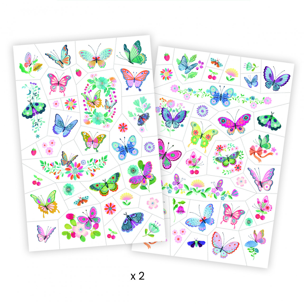 Tatuaje temporare cu fluturi și sclipici – 2 foi cu tatuaje colorate și sclipitoare, ușor de aplicat și testate dermatologic. Vârsta recomandată: 3+. Producător: Djeco, Franța.